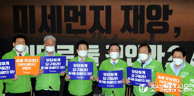 (조세금융신문=김용진 기자)정동영 민주평화당 대표와 장병완 원내대표,의원들이 8일 오전 국회에서 열린 제2차 최고위원·국회의원·상임고문·시도당 위원장 연석회의에 앞서 마스크를 쓰고 정부의 미세먼지 대책을 촉구하고 있다
