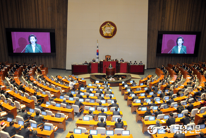 (조세금융신문=김용진 기자)나경원 자유한국당 원내대표가 12일 오전 열린 국회 본회의에서 교섭단체 대표연설을 하고 있다