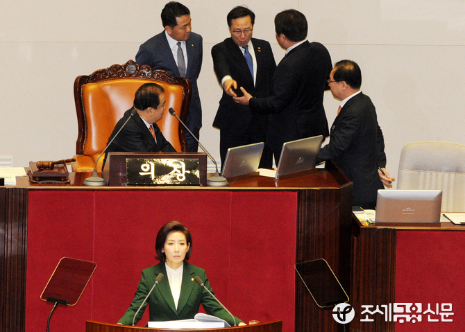 (조세금융신문=김용진 기자)나경원 자유한국당 원내대표가 12일 오전 국회 본회의장에서 교섭단체 대표연설을 하던 중 문 대통령이 북한의 대변인이라는 발언을 하자 홍영표 더불어민주당 원내대표(뒷줄 가운데)가 국회의장석으로 나가 강하게 항의하고 있다