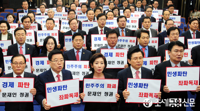 (조세금융신문=김용진 기자)황교안 자유한국당 대표와 나경원 원내대표, 지도부와 소속 의원들이 13일 오후 국회에서 '민생 경제파탄 문재인 정권', '민생파탄 좌파정권' 등의 손피켓을 들고 구호를 외치고 있다.
