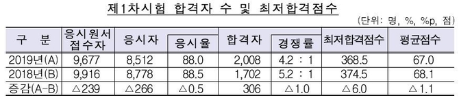 올해 커트라인(최저합격점수)은 368.5점으로 지난해 대비 6점 낮아졌으며 합격자 평균 점수도 지난해 보다 1.1점 하락한 67점으로 집계됐다. 응시자 전체 평균 점수는 51.9점으로 1.1점 상승했다.