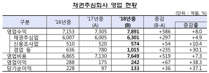 채권수심업 영업수익이 6005억원에서 6301억원으로 297억원 늘어났으며 신용조사업 영업수익도 520억원에서 574억원으로 소폭 증가했다.