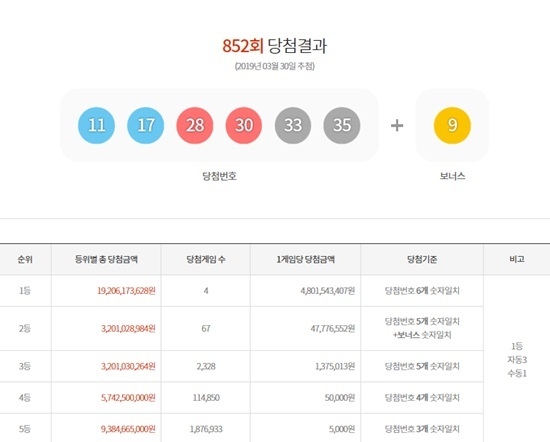 로또 852회 당첨번호를 모두 적중한 1등은 모두 4명으로 개인당 19억 2천만 원을 받게 된다.