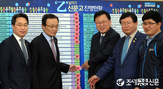 (조세금융신문=김용진 기자)이해찬 더불어민주당 대표가 1일 오전 국회에서 희망연대노조 방송스태지부 업무환경개선에 기여한 을지로위원회에 상생 꽃을 달아주고 있다.