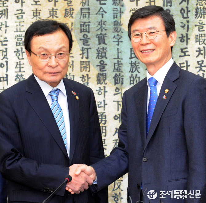 (조세금융신문=김용진 기자)이해찬 더불어민주당 대표(왼쪽)가 11일 오후 국회 대표실을 예방한 문성혁 해양수산부 장관과 인사하고 있다
