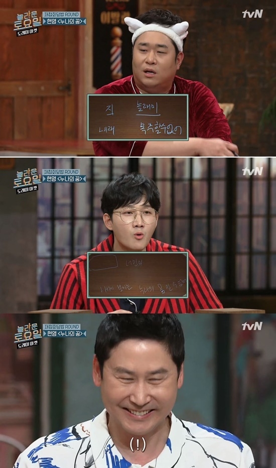 13일 방송된 tvN '놀라운 토요일'에서 출제된 문제는 바로 방송인 현영의 '누나의 꿈'. 해당 곡의 가사는 바로 "찜했어 너만이 내게 보인 동안 못 가 별 수 없어"이다.