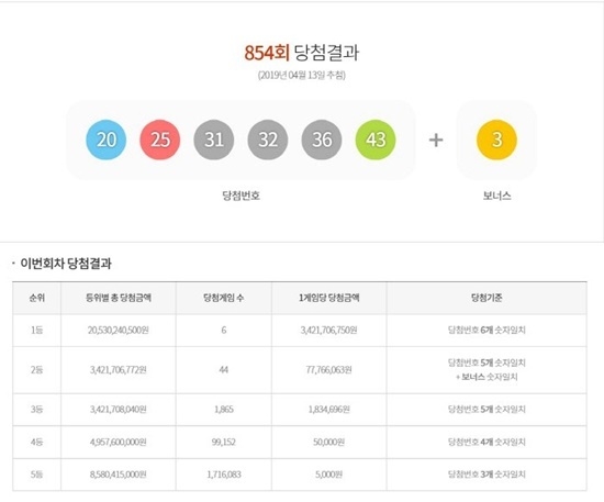13일 동행복권 측이 공개한 로또854회당첨번호는 20, 25, 31, 32, 36, 43이며 보너스번호는 3이다.