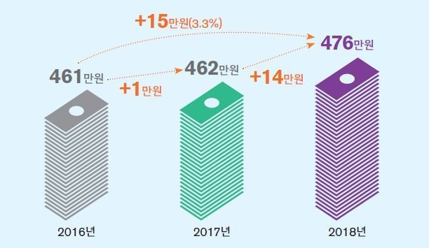 16일 신한은행이 발표한 ‘보통사람 금융생활 보고서’에 따르면 지난해 월 평균 가구 총소득은 476만원을 기록했다. 이는 전년(462만원) 대비 14만원(3.03%) 증가한 수치다. 2017년에는 전년 대비 1만원 증가한데 비해 소득이 크게 개선된 모습이다.