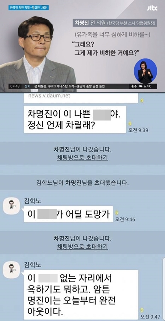 그의 일침에 곧 메신저 탈출을 시도한 차 전 의원, 하지만 십 분 만에 김 교수의 초대로 인해 그는 메신저로 재소환됐고 그를 향한 욕설이 또다시 쏟아졌다.