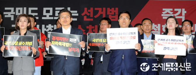 (조세금융신문=김용진 기자)황교안 자유한국당 대표, 나경원 원내대표 등 의원들이 24일 오전 국회에서 열린 비상의원총회에서 선거법·공수처법 철회를 촉구하는 규탄 구호를 외치고 있다.