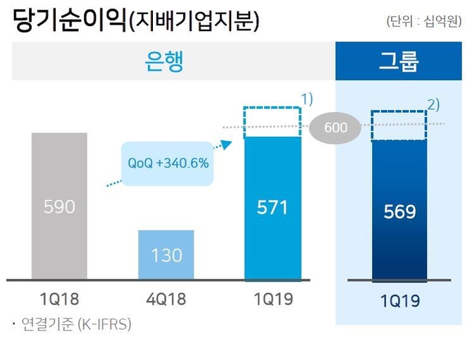 지주사 회계처리방식 변경으로 인한 지배지분 순이익 감소분(약 380억원)을 포함할 경우 순익은 6000억원대로 늘어난다.