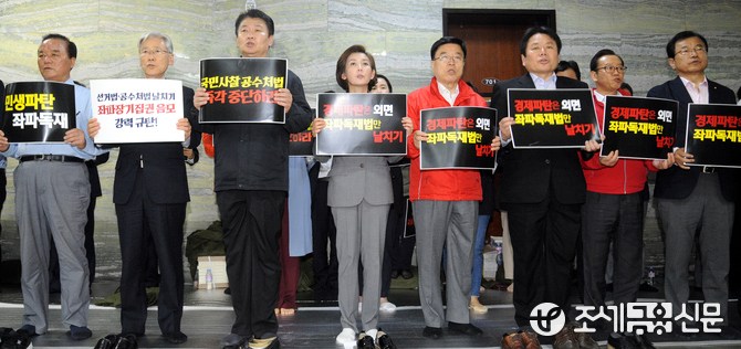 (조세금융신문=김용진 기자)나경원 자유한국당 원내대표와 의원들이 26일 오전 국회에서 열린 자유한국당 긴급 의원총회에서 구호를 외치고 있다.