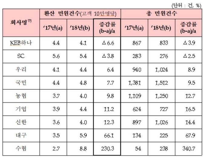 총 민원건수는 KB국민은행이 1512건으로 가장 많았으며 농협은행(1250건)과 신한은행(1026건), 우리은행(1024건)도 높은 수치를 기록했다. 증가율은 수협은행이 340.7%로 가장 높았으며 대구은행(67.9%)과 기업은행(16.5%)이 그 뒤를 이었다.