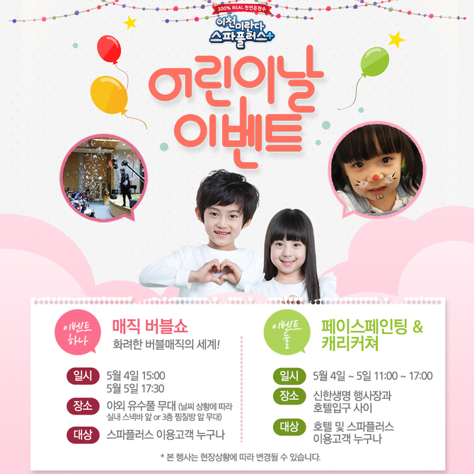 금번 행사는 5월 4일~5일 양일간 진행할 예정이며, 매직버블쇼의 경우 야외 유스풀 아일앤드 또는 실내수영장에서 5월 4일은 15시, 5월 5일은 17시 30분시작하며 페이스페인팅(캐리커쳐그리기)은 양일 11시부터 17시까지 스파플러스 입구에서 진행 될 예정이다.