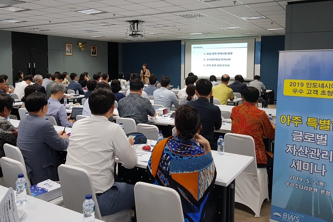 우리은행은 지난 2일 인도네시아 우리소다라은행 본점에서 ‘글로벌 자산관리 세미나’를 실시했다고 3일 밝혔다. 인도네시아 한인과 사업가, 주재원 등 100여명이 참여한 이번 세미나는 현지 한인들의 한국 세무와 부동산에 대한 문의 등을 반영해 마련했다.