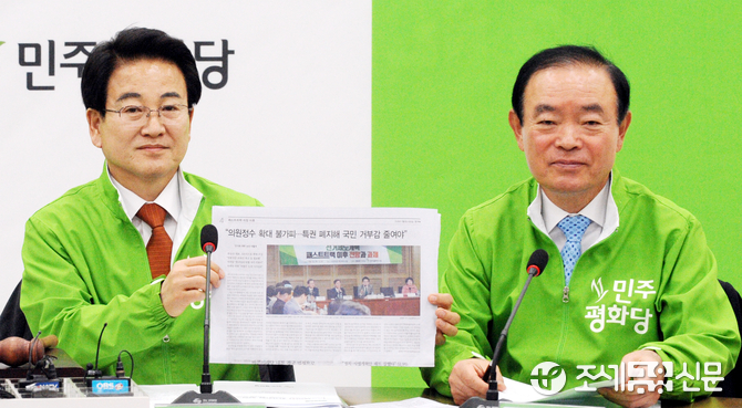 (조세금융신문=김용진 기자)정동영 민주평화당 대표가 3일 오전 국회에서 열린 최고위원-국회의원-상임고문 연석회의에서 민주평화당 선거제도개혁 관련 토론회 오늘자 신문기사를 들어 보이고 있다.