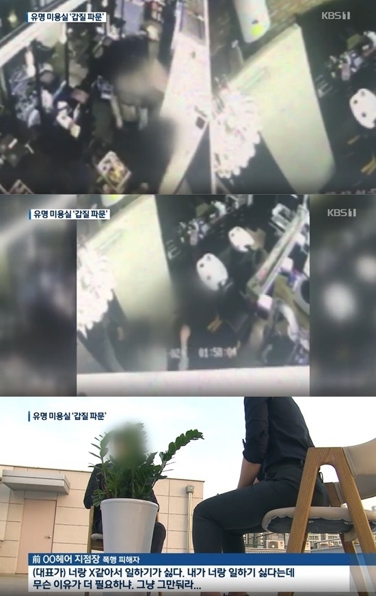 KBS가 공개한 동영상에서 미용실 대표 A씨가 느닷없이 지점장 B씨의 안면에 주먹을 휘둘렀다. 곧바로 도망가는 길을 뒤따라가 B씨의 머리채를 잡아끌어 경악을 자아내게 했다.
