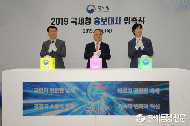 (조세금융신문=김용진 기자) 9일 오전 서울 종로구 서울지방국세청에서 열린 '2019 국세청 홍보대사 위촉식'에서 홍보대사로 위촉된 한승희 국세청장, 이제훈 배우가 축하 퍼포먼스를 하고 있다