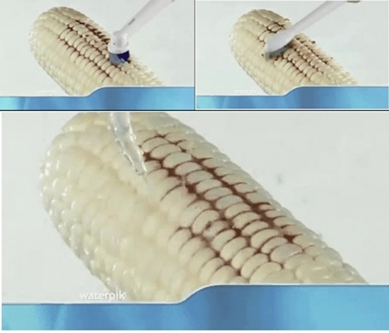 '워터픽의 위엄'이라는 제목을 가진 해당 움짤 속에는 치아 구조와 유사하게 생긴 옥수수 곳곳에 오염물이 묻어 있는 모습이 담겨 있다.