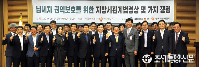 (조세금융신문=김용진 기자)박광현 한국지방세협회 회장이 오문성 한국조세정책학회 회장, 곽장미 한국세무사고시회 회장, 김병관 더불어민주당 의원과 24일 오전 국회 의원회관에서 열린 지방세 세미나에서 참석자들과 파이팅을 외치며 기념 촬영을 하고 있다.