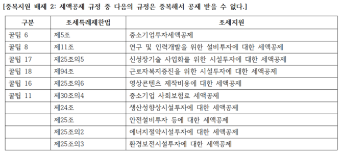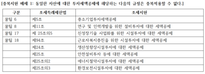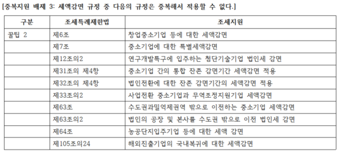 아래의 조항별 중복적용 배제규정을 반드시 확인하여 중복적용이 배제되는 조세지원 규정이 있다면 그 중 더 가장 유리한 규정을 선택하여 적용할 수 있는 노련함을 발휘해 보자.