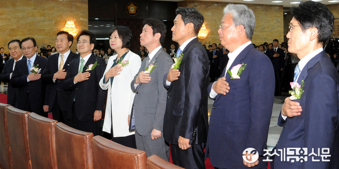 (조세금융신문=김용진 기자)문희상 국회의장과 각 당 대표, 원내대표들이 국회에서 열린 제71주년 국회개원기념식에서 국기에 대한 경례를 하고 있다.