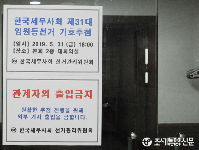 (조세금융신문=김용진 기자) 31일 오후 18시에 열릴 한국세무사회 제31대 임원등 선거 기호 추첨이 비공개로 진행된다는 안내문이 부착돼 있다.