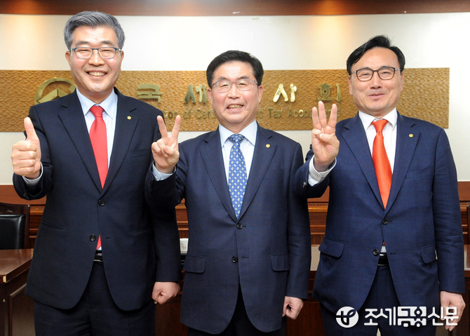 (조세금융신문=김용진 기자)31일 오후 한국세무사회 회관에서 열린 한국세무사회 회장 후보로 출마한 후보들이 자신의 기호 번호를 들어 보이며 지지를 호소하고 있다.(왼쪽부터)원경희, 이창규, 김상철 한국세무사회 회장 후보.