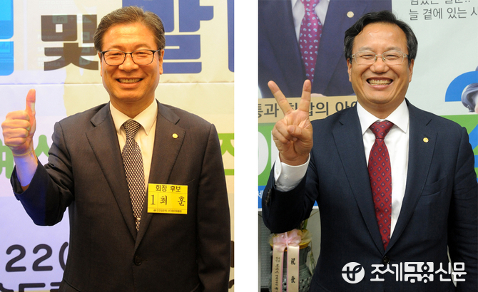 (조세금융신문=김용진 기자)인천지역세무사회 회장 선거를 이틀 앞둔 12일 후보들이 자신의 기호를 들어 보이며 지지를 호소 하고 있다.(왼쪽부터)기호1번 최훈 인천지역세무사회 회장 후보, 기호2번 이금주 인천지역세무사회 회장 후보