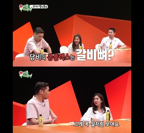 그러던 중 그녀는 "사실 갈비뼈가 톡 튀어나와 마치 살처럼 보인다"고 콤플렉스를 고백, 이를 듣던 신동엽이 "비키니 같은 의상을 입으면 도드라져 보이겠다"고 말하자 공감하기도 했다.