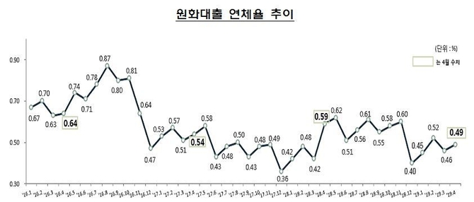금융감독원은 4월말 기준 국내은행의 원화대출 연체율(1개월이상 원리금 연체기준)이 0.49%를 기록했다고 19일 밝혔다.
