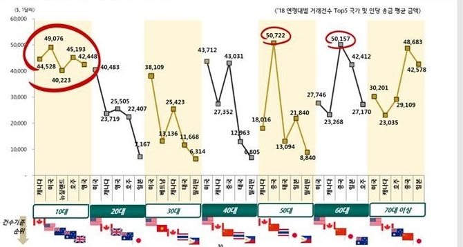 30대까지는 선진국으로의 유학자금이 주를 이루지만 50대부터는 중국으로의 송금이 가장 많은 것으로 나타났다.