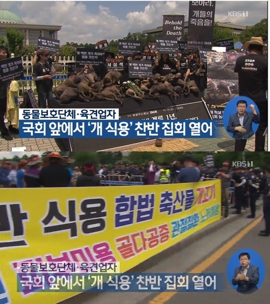 초복인 오늘(12일) 국회 앞에서 개고기 식용에 대한 찬반 집회가 진행됐다. 이날 집회에는 수십개의 동물권 단체, 육견협회 등이 참석해 각자의 목소리를 높였다.