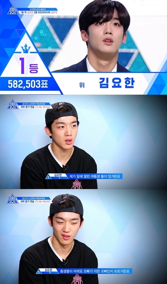 (조세금융신문=김효진 기자) 3차 '프로듀스 x101' 순위 발표식에서 1등을 거머쥔 위 김요한 연습생이 동생 걱정에 한숨을 내쉬었다.