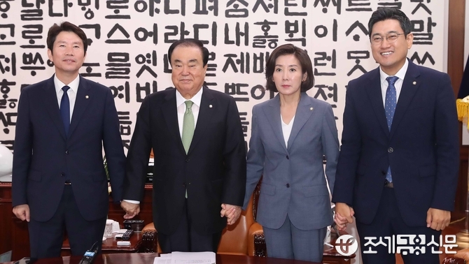 (조세금융신문=김용진 기자)15일 오전 국회에서 열린 교섭단체 원내대표 회동에 앞서 포즈를 취하고 있는 대표들. 이인영 더불어민주당 원내대표, 문희상 국회의장, 나경원 자유한국당 원내대표, 오신환 바른미래당 원내대표.(왼쪽부터)