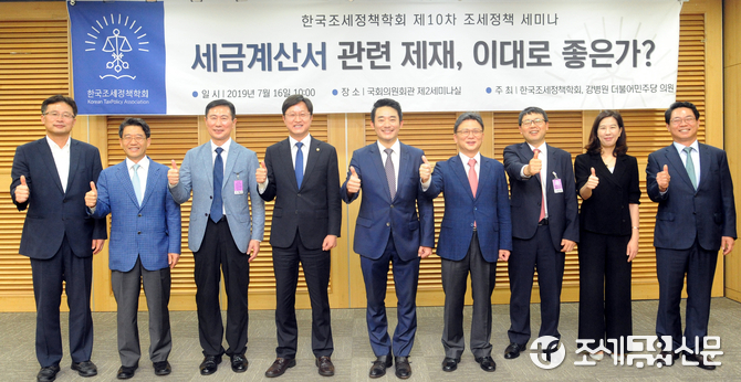 (조세금융신문=김용진 기자) 오문성 한국조세정책학회장과 강병원 더불어민주당 국회의원이 16일 오전 국회의원회관에서 열린 세금계산서 관련 제재 이대로 좋은가 토론회에서 참석자들과 파이팅을 외치고 있다.