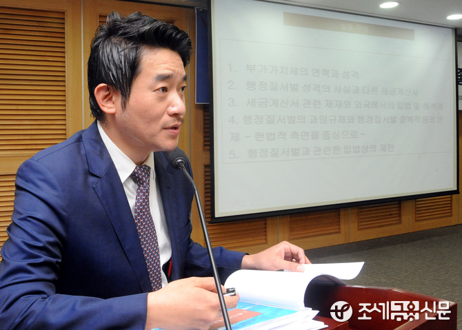 (조세금융신문=김용진 기자) 권형기 법무법인 평안 변호사가 16일 오전 국회의원회관에서 열린 '세금계산서 관련 제재 이대로 좋은가' 토론회에서 주제 발표를 하고 있다.