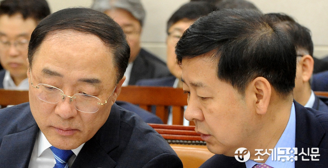(조세금융신문=김용진 기자) 홍남기 경제부총리 겸 기획재정부 장관이 18일 오전 국회에서 열린 기획재정위원회 전체회의에서 구윤철 기획재정부 2차관과 대화하고 있다.