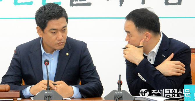 (조세금융신문=김용진 기자)오신환 바른미래당 원내대표가 23일 오전 국회에서 열린 원내대책회의에서 채이배 의원과 대화를 하고 있다.