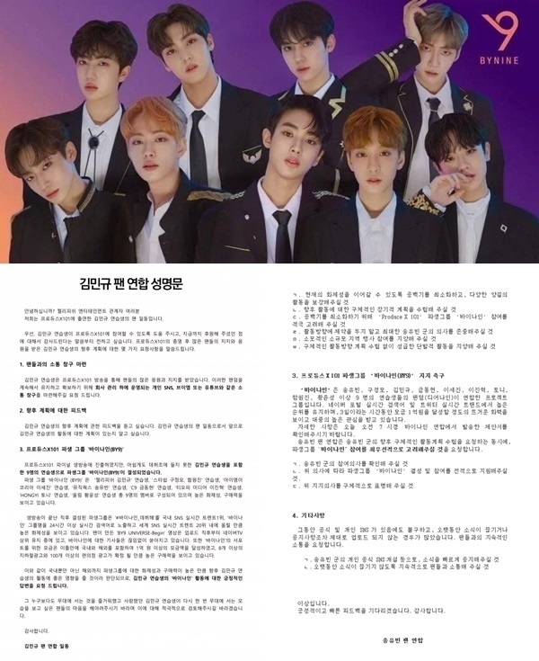 특히 23일 디시인사이드 김민규 마이너 갤러리와 송유빈 마이너 갤러리에선 각각 젤리피쉬·뮤직웍스 소속사에 팬 연합 성명문을 전송, 이들의 'BY9' 참여 및 향후 행보에 대한 촉구 입장을 표하기도 했다.