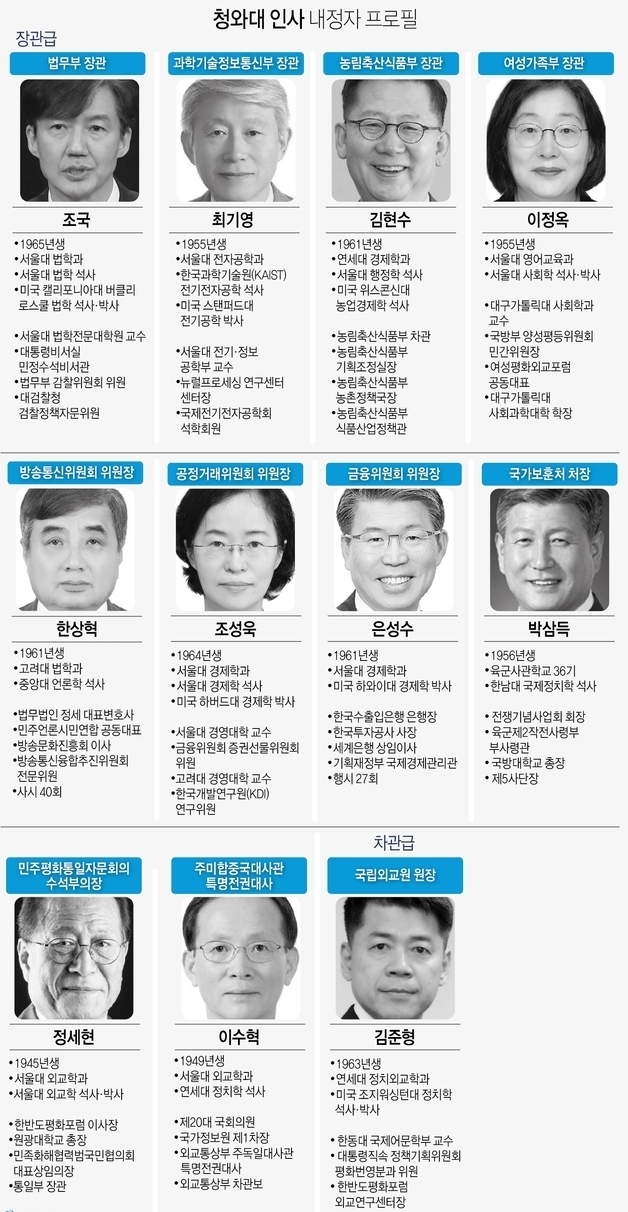 한상혁 방송통신위원장 후보자, 조성욱 공정거래위원장 후보자, 은성수 금융위원장 후보자, 박삼득 국가보훈처장 내정자 등도 해당 분야에서 손꼽히는 전문가로 분류된다.