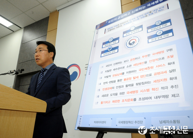 (조세금융신문=김용진 기자)정철우 국세청 기획조정관이 12일 오전 정부세종청사 국세청에서 '국민의 공감과 신뢰를 위한 국세행정 혁신' 브리핑을 하고 있다