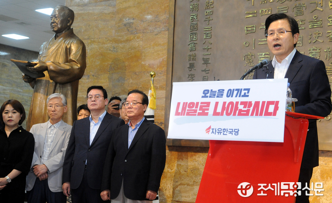 (조세금융신문=김용진 기자)황교안 자유한국당 대표가 14일 오후 국회 본관 중앙홀에서 오늘을 이기고 내일로 나아가자는 내용의 대국민 담화문을 발표하고 있다.