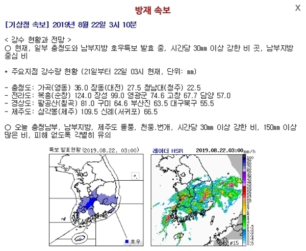(조세금융신문=김효진 기자) 2019년 8월 22일 3시 10분을 기준으로 기상청에서 강수현황과 전망을 내 놓았다.