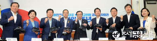 (조세금융신문=김용진 기자)이해찬 더불어민주당 대표와 이인영 원내대표, 최고위원들이 23일 오전 국회에서 열린 당 대표-최고위원 취임 1주년 공동 기자회견에서 열심히 뛰자는 취지로 운동화를 들고 파이팅을 외치고 있다.
