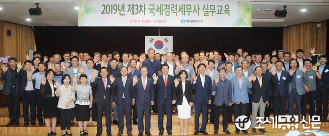 (조세금융신문=김용진 기자)원경희 한국세무사회 회장이 26일 오전 한국세무사회 회관에서 열린 2019년 제3차 국세경력세무사 실무 교육에서 고은경 한국세무사회 부회장 ,장운길 한국세무사회 부회장이 참석자들과 손을 흔들며 인사를 하고 있다.