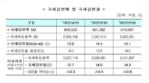 한편, 올해 국세감면액은 50.1조원으로 감면율은 법정한도(13.6%)보다 0.9%p 높은 14.5%가 될 전망이다.