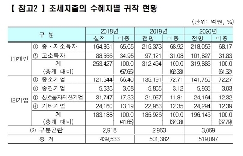 내년 고소득자 감면비중은 올해 31.08%에서 내년 31.83%로 늘어나며, 중저소득자 감면비중은 올해 68.92%에서 내년 68.17%로 줄어든다.
