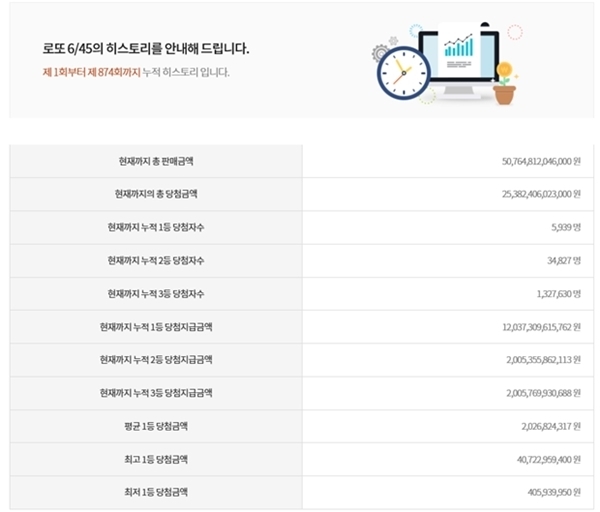 동행복권에 따르면 현재까지 로또의 총 판매금액(1회~874회까지)은 약 50조 7648억이며, 1등 당첨자수는 5,939명이다.