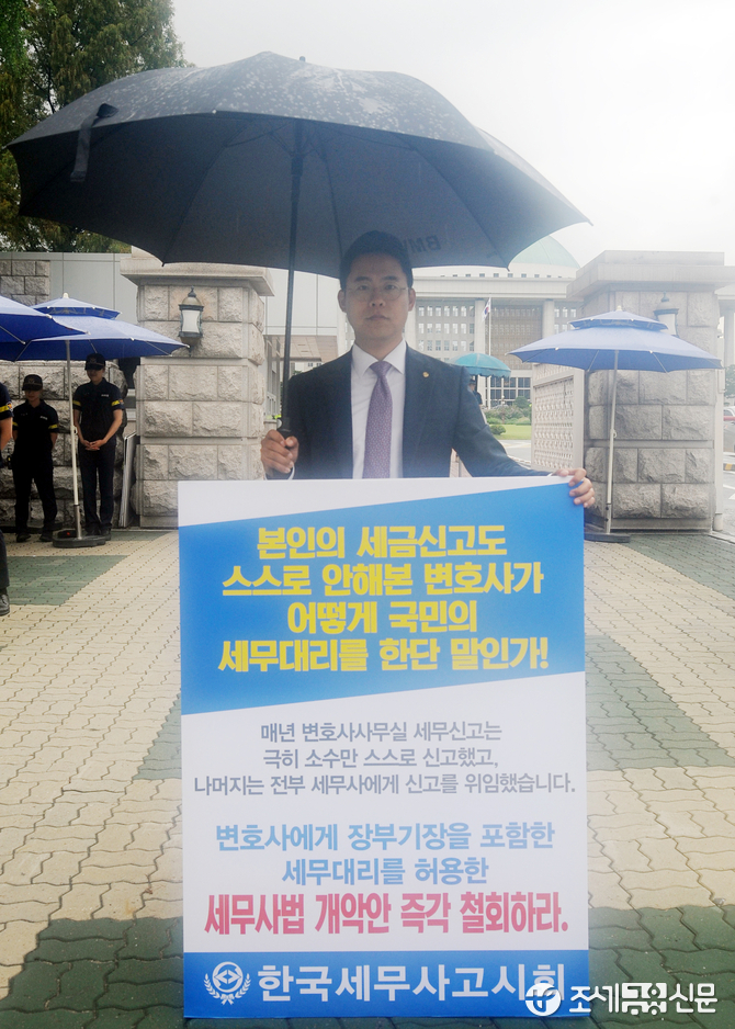 (조세금융신문=김용진 기자) 김희철 한국세무사고시회 사업부장이 4일 오후 국회 정문 앞에서 변호사에게 장부 기장을 포한한 세무대리를 허용한 세무사법 개악안 철회 하라는 1인 시위를 하고 있다.